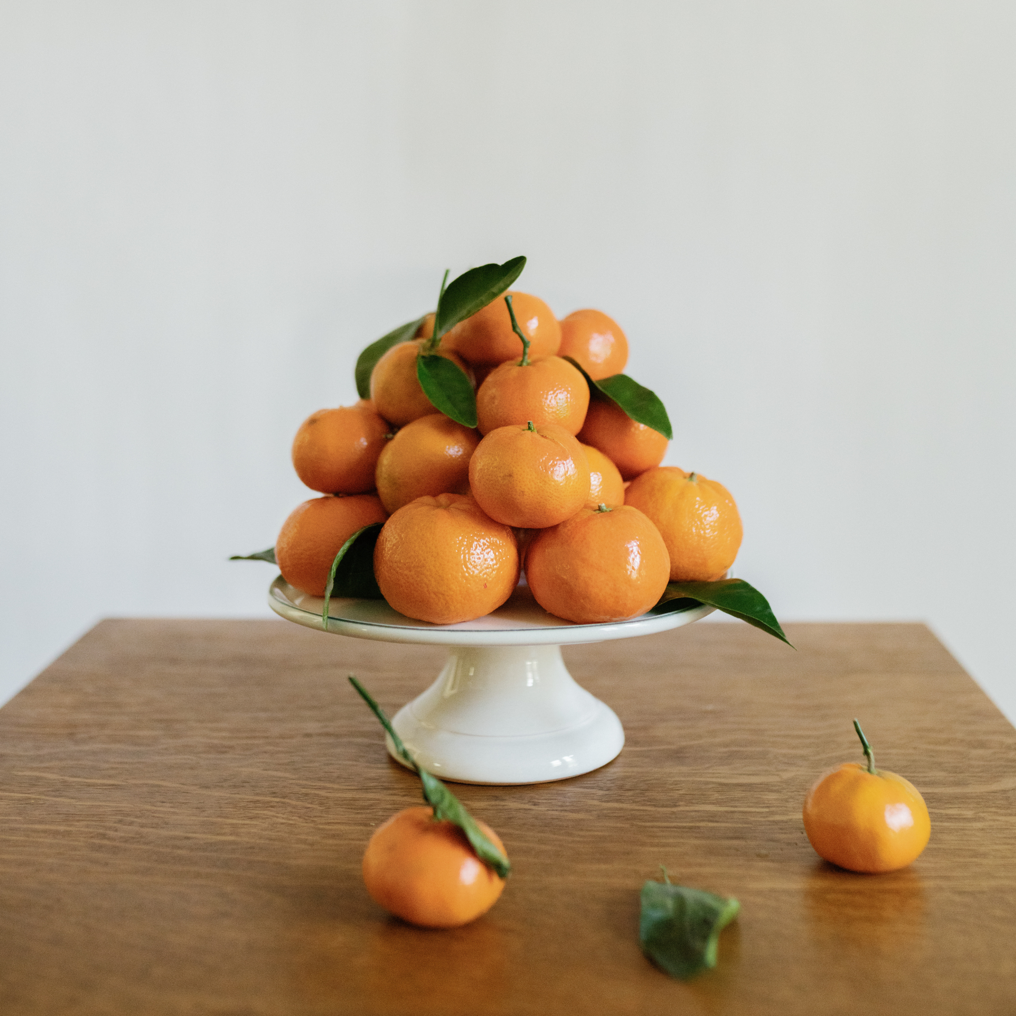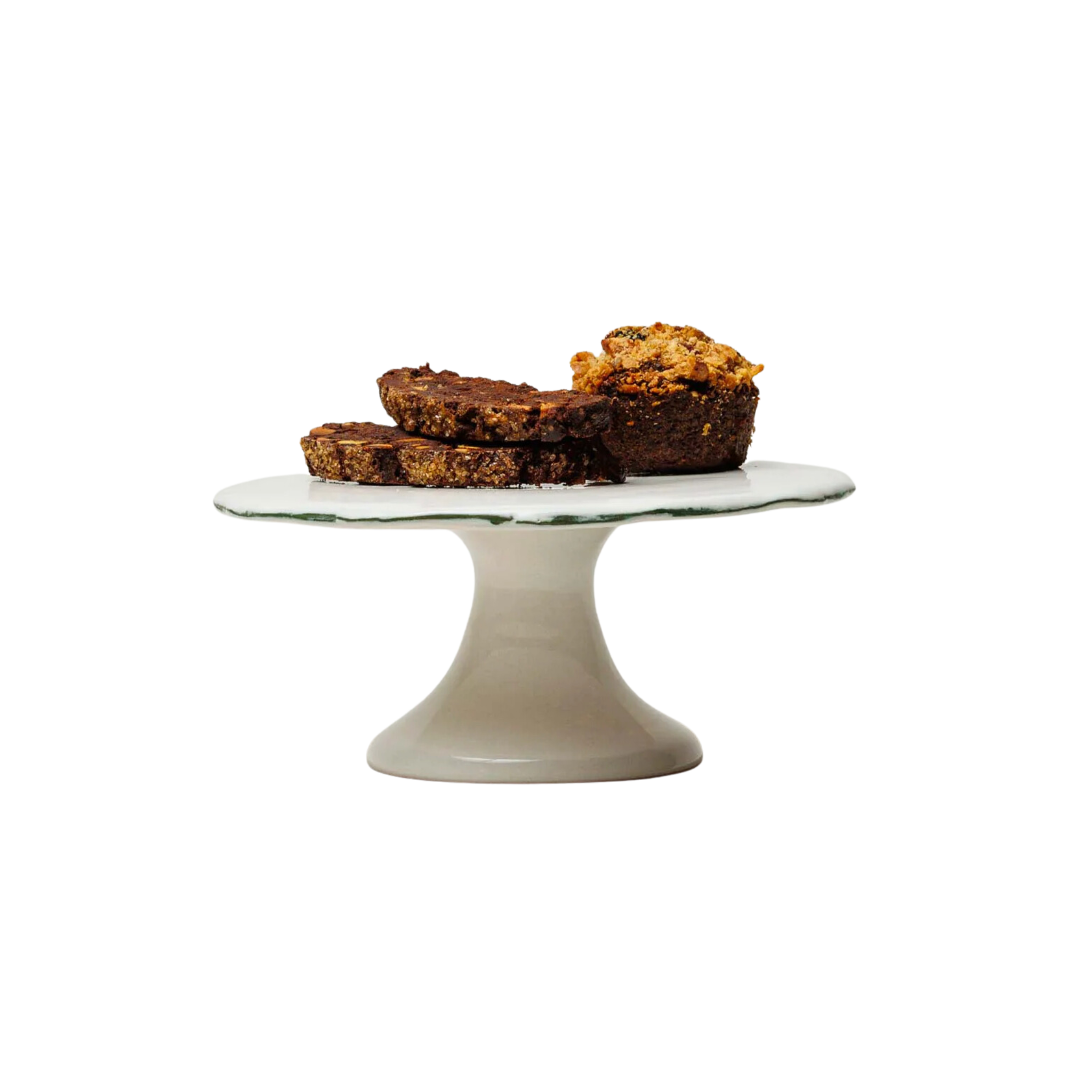 Cake stand that's hand painted in gleaming white glaze over brown terra cotta and finished with a green edge.