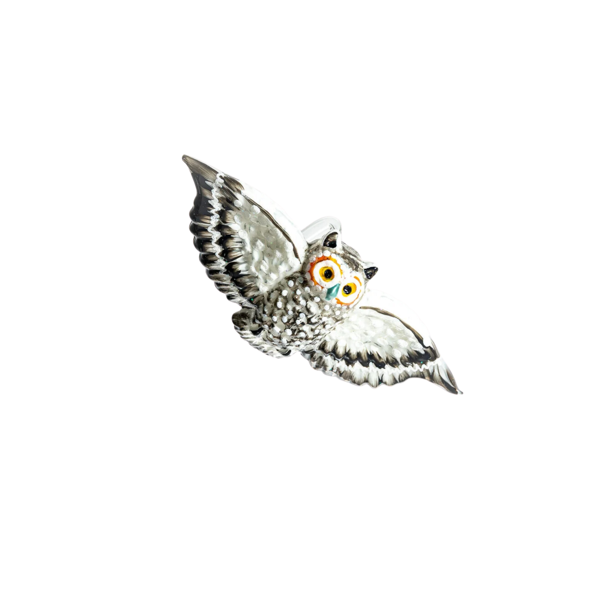 A sparkly, not at all spooky, snow covered owl.